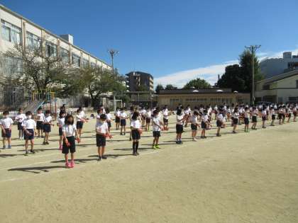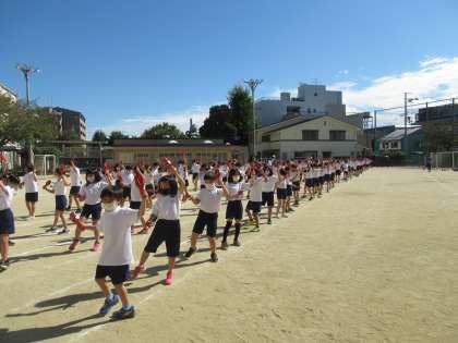 初めて3年生と4年生と合同で,よさこい鳴子踊りの練習をしました。運動場で自分の立ち位置やならび方,入場や退場の仕方も確認しました。2学年(160人を超えます)で踊ると,鳴子の音もよく響き,とても見ごたえがありました。