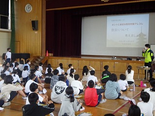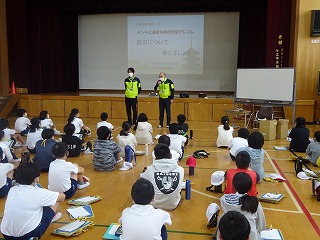ハナヤ学習では防災についての学習を進めています。今回は下京区役所の地域力推進室の地域防災担当の方をお招きして,防災についてどのようなことを備えておけばよいのかお話をしていただきました。
