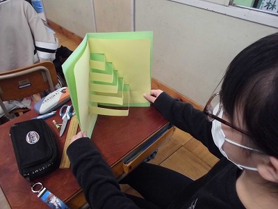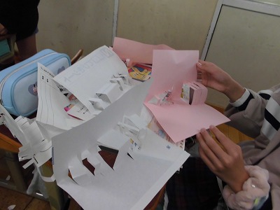 図画工作科の「カードで伝える気持ち」の学習で,お家の人に日頃の感謝の気持ちを表そうとカードづくりをしています。今日は,立体的に飛び出す仕組みをいろいろ試してみました。どんな作品ができあがるか楽しみにしていてください。