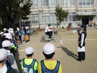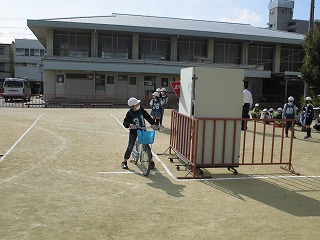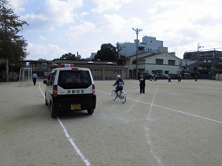 下京警察署の方や地域の方々にお世話になり,自転車の安全な乗り方を学びました。停止線で止まって曲がり角を出るときは,少しずつ前に出て安全確認をすることや車の横を通るときは,後方確認や車のドアが開かないかを確認することなどを実際に自転車に乗って実技試験を受けました。昼からは標識や自転車マナーなどの学科試験を受けました。3〜4か月後には,自転車免許証が送られてくる予定です。これから自転車に乗る機会があると思います。今日の学習を思い出して,事故がないように安全に乗ってほしいです。