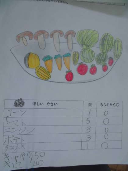 自分が元気になるサラダについて,友達に紹介しました。「ヘルシーサラダ」「ミックスサラダ」など名前をつけて,どんな材料をいくつ入れたのか話しました。友達と紹介しあったあと,GIGA端末の動画撮影機能をつかって,ロイロノートで提出しました。