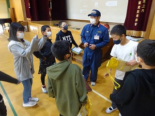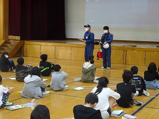 ハナヤ学習では防災についての学習を進めています。今回は中堂寺消防出張所の署員の方をお招きして,風水害や地震が起きた時にどのように行動したらいいのか,また風水害や地震に備えてどんなことが大切なのかなど,様々なお話を聞かせていただきました。