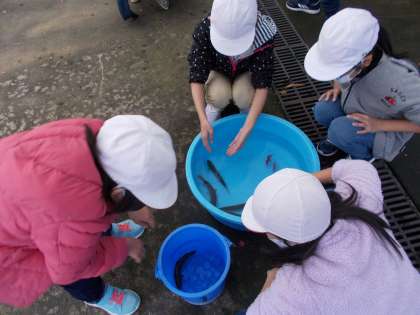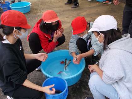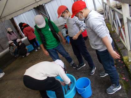 「生きている魚をつかむのは初めてなので,どきどきしています」。はじめに,気持ちを発表してくれた子どもたち。はじめは,おっかなびっくり,でしたが,だんだんと慣れ,「もう一度つかみたい」と言っている子どもたちもいました。あちらこちらで,楽しい歓声があがります。