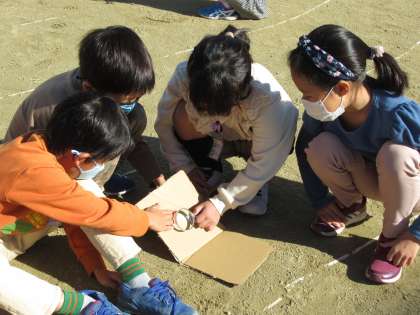 「虫めがねで日光を集めると,明るさやあたたかさはどのようになるのか」についても実験しました。虫めがねを上下に動かして,上手に日光を集めることができました。日光を集中させると,かなり明るくなりました。