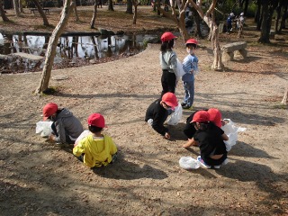 公園の中を歩きながら,秋のものが落ちていないか探しました。落ち葉やどんぐりなどたくさんの「あき」を見つけることができました。「こっちのどんぐりは,帽子がついてる!」「この葉っぱの形おもしろい!」といろんな発見をしていました。