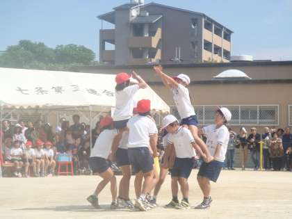 4年生の団体競技は騎馬戦です。迫力があり,見ている観客も力が入りました。大いに盛り上がりを見せた騎馬戦でした。4年生の凛々しい姿が印象に残りました。