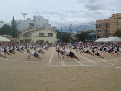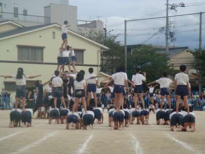 運動会のラストを飾ったのは,5・6年生の団体演技「ピクシー」です。これまで,毎日汗まみれ,砂まみれになって練習をしてきました。「絶対成功させるぞ!」という強い思いが伝わってくる演技でした。一つ一つの演技に大きな拍手が送られていました。最後のタワーが立ったときには,割れんばかりの拍手が運動場に響きました。感動いっぱいの演技でした。