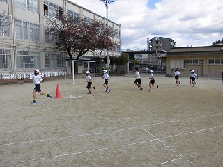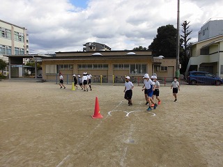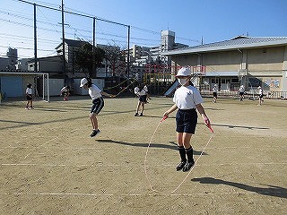 体育科では「ゆっくりペース走」と「なわとび」を学習しています。ゆっくりペース走では,自分たちでつくったコースを無理のない一定の速さで走ることをめあてに学習しました。なわとびでは,あやとびや交差とび,二重とびなどに挑戦していました。