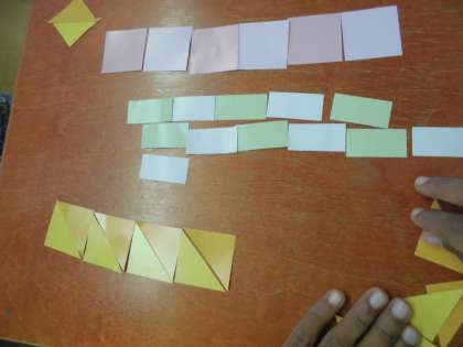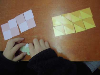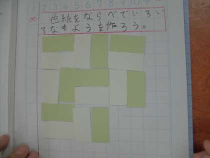「三角形と四角形」の学習では,長方形や正方形,直角三角形を並べたら,いろいろな形が作れることが分かりました。教科書にのっている模様以外にも,オリジナルの模様を考えたり,自学でもう一度形を並べて復習している人がいました。