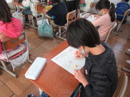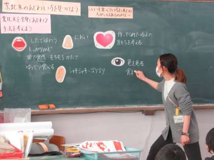 今日の学級活動の時間に,「京北米の味わい方を見つけよう」という学習をしました。学習のはじめに,味わうときには体のどの部分を使うかについて考えました。「歯を使ってしっかりとかんだり舌で味を感じたりする。」「鼻でにおいをかぐ。」「耳を使って,シャキシャキなど,かんだ時の音を感じる。」「目で色や形を見る。」など,子どもたちからたくさんの味わい方が出てきました。「心を使って,つくってくれた人の気持ちを考えながら味わう。」という意見もあり,驚きました。
