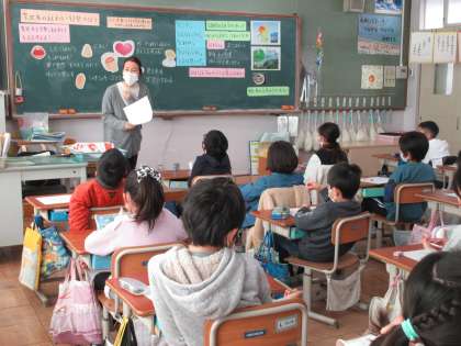 その後,栄養教諭から,京北地域の位置や気候・京北米をつくっている方のお名前やつくっているときに気を付けておられることなどを教えてもらい,京北米について,より関心をもつことができました。