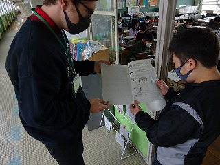 外国語では,これまでの学習を通してまとめた先生紹介のカードを使って,ALTの先生に自分のインタビューした先生のことを紹介しました。紹介した後にはALTの先生から質問されたり,コメントをもらったりしました。