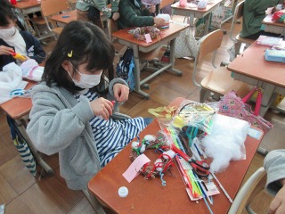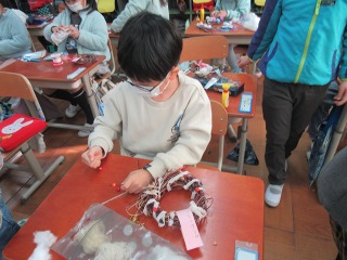 自分の育てたアサガオのツルを使ってリースをつくりました。みんな黙々と飾りつけをし,それぞれ違った素敵なリースが完成しました。完成した後は,みんなのリースを見せ合いっこし,お互いに褒め合いました。冬休み前に持って帰るので,お家でもクリスマスに向けて是非飾ってみてください✨