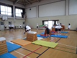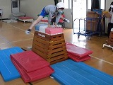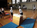 体育科でとび箱運動の学習をしています。開脚跳びや抱え込み跳び,台上前転に取り組んでいます。技をしている友達の後ろや横から見て,踏み切りや着手の様子のアドバイスを出しながら学習しています。友達の技を見て,「もっと手を奥についた方がいいかな。」「踏み切りの時に足がずれているよ。」などたくさんアドバイスを出すことができました。