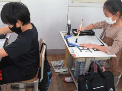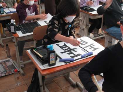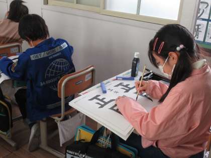 今週は,3クラスとも毛筆の学習に取り組みました。書いた文字は「正月」です。