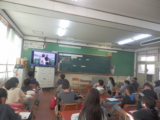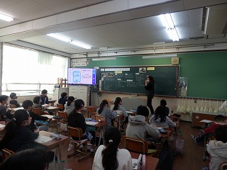 栄養教諭の松崎先生と京野菜と京野菜を作る生産者の思いについて学習しました。まず,京野菜の一つである「賀茂なす」の特ちょうについて動画を見ました。そこでは,一般的ななすに比べて丸い形であったり,鮮やかな色,つやがあることを知りました。そのような「賀茂なす」を作るために日光の調整をしていることや,収穫のときに傷がつかないように白いネットで覆いをしていること,同じ大きさの賀茂なすを箱に隙間なく詰めることなど「丁寧に」「多くの時間をかけて」作られていることを学習しました。そして,なぜそのように手間をかけて作っているのかということについて「賀茂なすを全国の人に知ってほしい。」「賀茂なすのおいしさに気づいてほしい。」「賀茂なすから京野菜のことを知ってほしい。」など生産者の思いについてたくさん考えることができました。