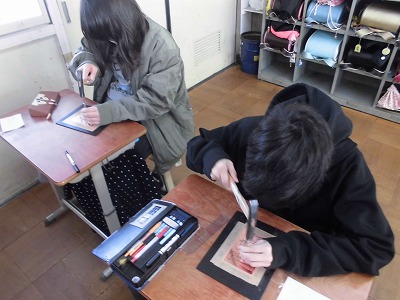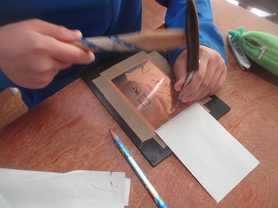 写った絵を油性ペンでなぞったら,たがねと金づちを使い,一打ち一打ち心を込めて打付けていきます。