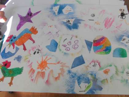 「たのしくうつして」の作品が完成しました!パスや絵の具で型をとるのを楽しみました。絵の具を使う時には,筆だけでなくゆびや布,ローラーなど材料を選んで型をとりました。型の中に描いた模様や表情も見どころです。3学期に飾ります。