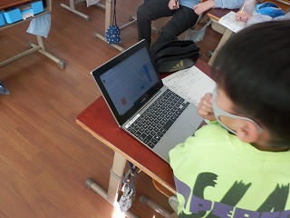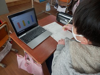ハナヤ学習の時間では自分たちで考えたオリジナルのエコライフチャレンジに11月から12月にかけて取り組みました。その結果を調査するため,ロイロノートを使ってアンケートを作りました。互いに答え合ったアンケートの集計結果を見て,どのような傾向があるのかを分析しています。