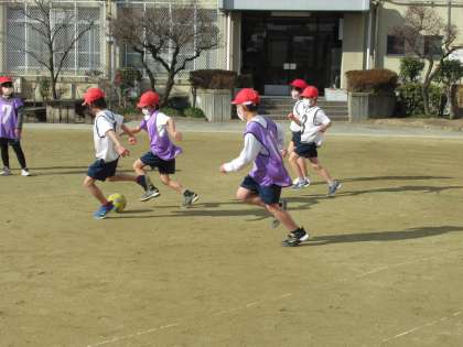 3学期が始まり1週間が過ぎました。体育科では,サッカーの学習に取り組み始めたところです。2学期に学習したエンドボールで学んだことを生かして,パスを回し,シュートをねらえるよう,チームでがんばっています。
