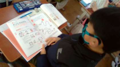 「おにごっこ」の学習では,教科書にのっている様々なおにごっこについて,遊び方を読み取ったりもっとおもしろくするための工夫を考えたりします。また,ほかにも遊びの本から,楽しい遊びを調べて友達に紹介します。写真は,いろいろな遊びを調べているところです。「いろいろな遊びがあるから,どれを紹介するかなやんでいます。」「ほかの遊びの本ももっと読んでみたい。」などと話していました。本でたくさん調べて,どの遊びを紹介するのかじっくり考えてほしいと思います。