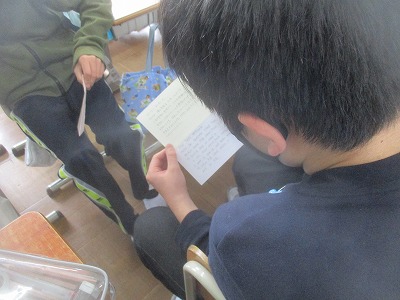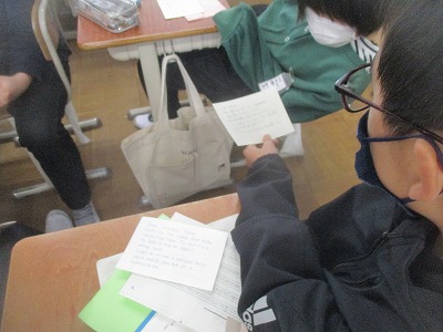 中学2年生に向けて書いた手紙に,お返事が届きました。さすが中学生,整った文章に感心しながら,「最初の方は読める!」「中学校のアドバイスをもらった」などと,嬉しそうに話し合っていました。