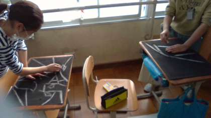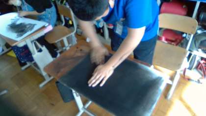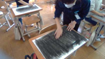 体全体を使って,コンテで色をぬりつぶしました。真っ黒になった手を見て,大はしゃぎの子どもたちです。