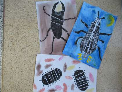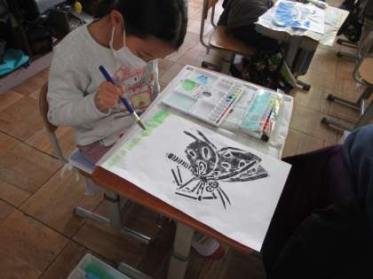3学期はじめの図画工作では,「いろいろうつして」という紙版画に取り組みました。2年生で学んだことを生かして,昆虫・小動物・魚などの中から自分の好きな生き物を作りました。画用紙だけでなく,段ボール紙・毛糸・モールなど,いろいろな材料を使って版を作っている子もいました。