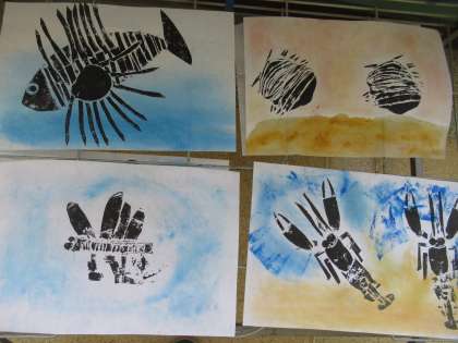 黒いインクで刷った後には,絵の具やコンテ・パスを使って,おもいおもいに作品を仕上げていました。