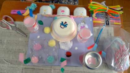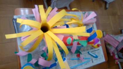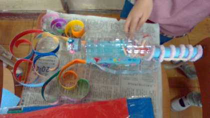 かざりを作って,くっつけています。音が鳴る場所がいくつかあったり,音の種類が違ったりと工夫が見られます。ダイナミックなかざりや繊細なかざりがあり,見ていて楽しくなります。そして,みんなで音を鳴らしてみたくなります。