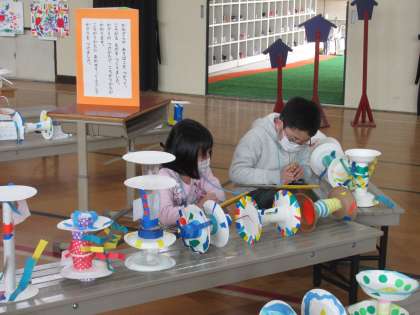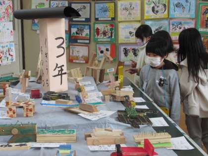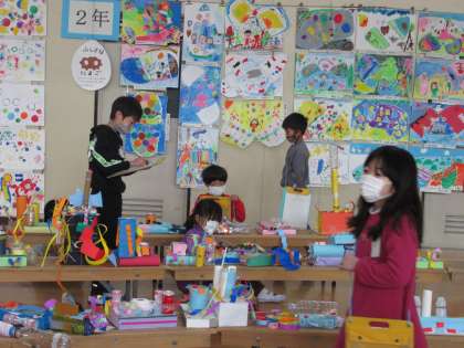 いろいろ力作を見て,すてきなところを見つけました。自分たちの作品も満足げに見ていました!他の学年の作品からは,「来年はこんなことをするんだ。」「これ私も作りたい!」と期待をふくらませていました。