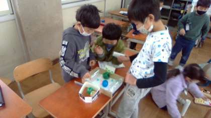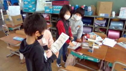 身近な材料を使って,どんな遊びができるか考え,遊びを楽しみました。自分たちのチームで遊んでためしながら,どんな工夫をしたら楽しいかを考えて,ルールを考えていました。