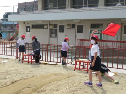 体育では,3クラスとも「はばとび」の学習に取り組んでいます。記録の計測の仕方にも少しずつ慣れてきました。