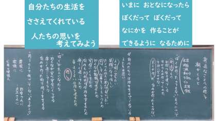 3月は,身近なことへの感謝について考えました。朝起きると,水道で顔を洗う。ご飯を食べる。ランドセルにノートなどをつめる。そして,くつを履いて学校へと行く。こういった普段の生活の中には,身の回りの様々なものは,自分以外のたくさんの人が作っているということを詩から気づくことができました。そして,これらに関わっている人々は,みんなが楽しく生活できるため,みんなが安心・安全に生活するため,人の役に立つためといったような願いや努力があるということを考えることができました。自分の周りの人に対して,気づかないでいた「ありがとう」について,家族に「いつも洗濯などの家事をしてくれてありがとう。」「いつもお家の人がご飯を作ってくれるのが当たり前だと思っていたけど,これからは感謝して食べたい。」,地域の人に「ごみ拾いをしてくれてありがとう。」,テレビ番組を作っている人に「家で当たり前のようにテレビを見ているけど,みんなが笑顔になるものを作ってくれてありがとう。」といった感謝の気持ちを考えることができました。