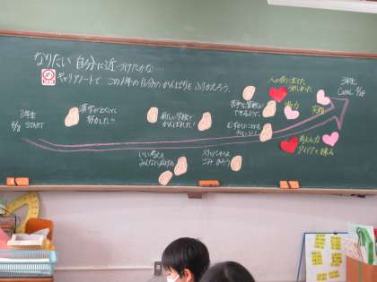 先週の学級活動の時間に,それぞれのクラスでキャリアノートを使って,この1年間のがんばりをふりかえりました。4月にえがいた「なりたい自分」に少しでも近づくことができたのかな…。なりたい自分に近づくために立てた目標や自分の取組はどうだったのか,一人一人じっくりとふりかえっていました。この1年間の中で忘れられない出会いや出来事・心に残った本なども書き込みました。