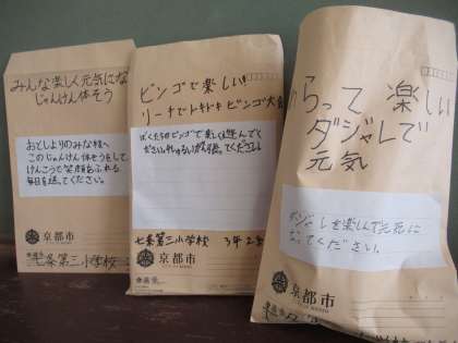 どのクラスも,お年寄りの方々の笑顔を思いうかべ,お年寄りの毎日を元気に楽しくしたいと願い,一生懸命つくりました。