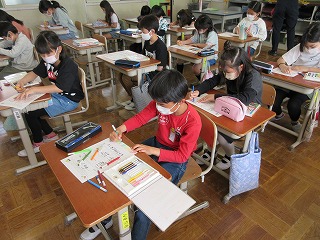 4時間目には,自分のことをもっとみんなに知ってもらうために,「がんばり&よろしくカード」に自分の好きなものや4年生でがんばりたいことを書きました。