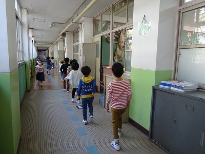廊下の通り方を学習した1年生。休憩の時,並んで右側を通る姿が見られました。全校のお手本です。