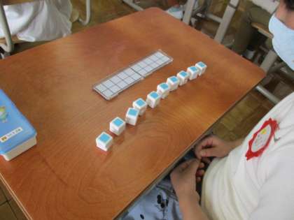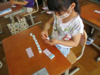 数図ブロックには丸いオレンジのマークの面と水色で四角のマークの面があることや,磁石になっていて数図ブロック同士がくっつくこと,積んだり並べたりできることを実際にさわって確かめました。