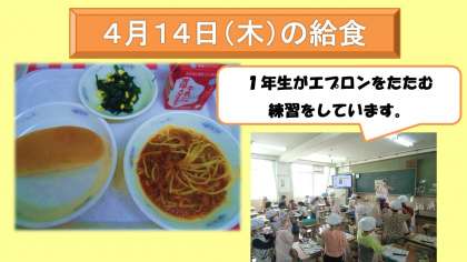4月14日(木)から,新学期の給食が始まりました。献立は,牛乳・小型コッペパン・スパゲティのミートソース煮・ほうれん草のソテー・りんごゼリーでした。人気メニューのスパゲティのミートソース煮ということで,前日から給食が始まるのを楽しみにしてくれている児童が多くいました。1年生にとっては,初めての給食で準備からドキドキしている子どももいましたが,いただきますの後は,にこにこしながら食べていました。上の学年では,おかわりに並んでいる姿も見られました。
