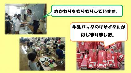リサイクルに向けて,牛乳パックの洗浄が始まりました。牛乳パックを開けて洗うのに苦労している姿もありましたが,牛乳パックをぺたんこにして,きれいに給食室へ返してくれてとてもうれしいです。