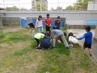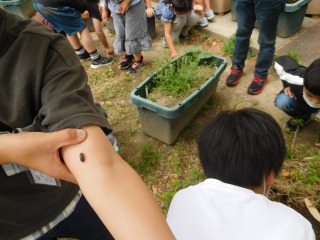 「見てみて,プランターの下の湿ったところにダンゴムシがいたよ。」