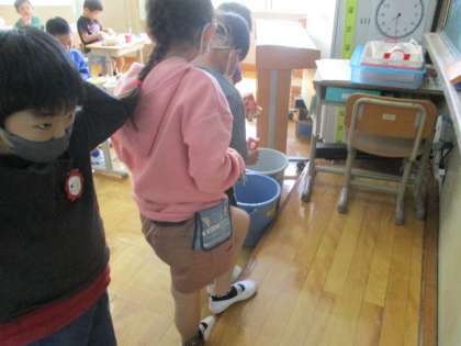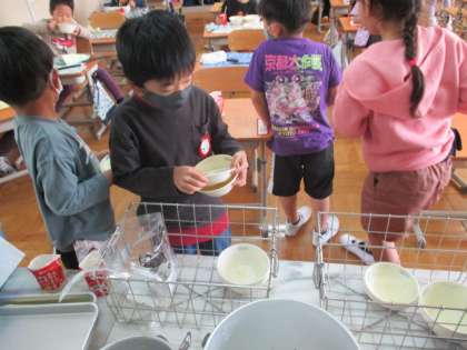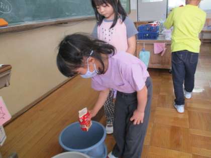 食器を大きさ別に入れたり,牛乳パックを洗ったりします。