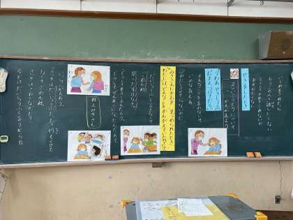 2年生の4月のこころの日の学習では,「せきをしたとき」というぜんそくで咳をしているみきさんがコロナだろと疑われたお話をもとに考えました。ぜんそくで咳が続いていたところ,コロナの感染を疑われたときのみきさんの気持ちや「コロナだろ。」言われたみきさんに見つめられた仲の良い私の気持ち,自分だったらこの女の子にどんな声をかけるかなどを考えました。