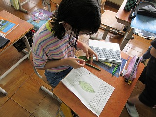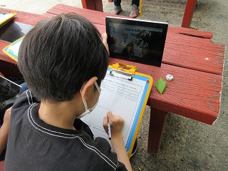 タブレットをもって外に出かけ,木や葉の様子をじっくりと観察し,写真に収めて観察カードに丁寧に記録しました。