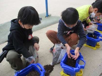 「ちゃいろのつちがいいとおもう」「えいようがあるつちがいる」「ふかふかのつちがいい」と考えを出し合ってから,一人ひとつの植木鉢に土を入れ,肥料を混ぜました。
