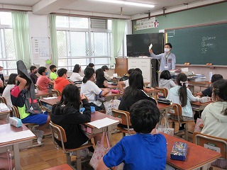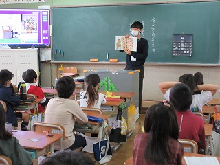 挿絵が見やすいように拡大投影機に映しながら読んでくださるボランティアの方,本にまつわるエピソードや思いを話す先生。ほんの10分間の短い間でしたが,貴重な時間となりました。
