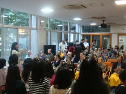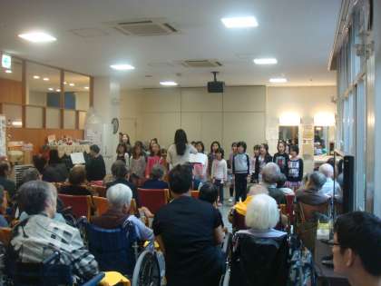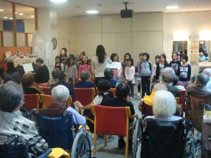 地域にある特別養護老人ホーム「西七条」で霜月音楽祭が行われ,合唱部の子どもたちが出演しました。「大空賛歌」「夕焼け」などを歌いました。歌を聞いておられるお年寄りは,笑顔いっぱいで,手拍子を打ちながら聞いてくださる方もおられました。「夕焼け」は会場のみんなで一緒に歌い,ほのぼのとした温かい空気に包まれました。アンコールもあって,とても喜んでもらえたようです。