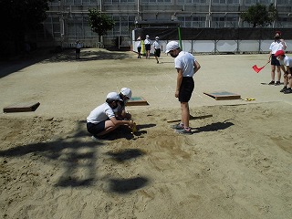 体育科では走り幅跳びでは,踏切線で踏み切っているか確かめるためにグループの子たちが試技の後にどこで踏み切ったかを伝えるようにしてグループ全員で記録が出るためにどうすればよいかということを考えながら学習しました。次からは助走や踏み切り,空中動作などでそれぞれのめあてをもって学習していきます。また,記録係や計測係,砂ならしなど自分たちの係も協力してできました。