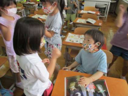 今日は音楽の学習で,リズム打ちやリズムにのってじゃんけんを一緒にしました。